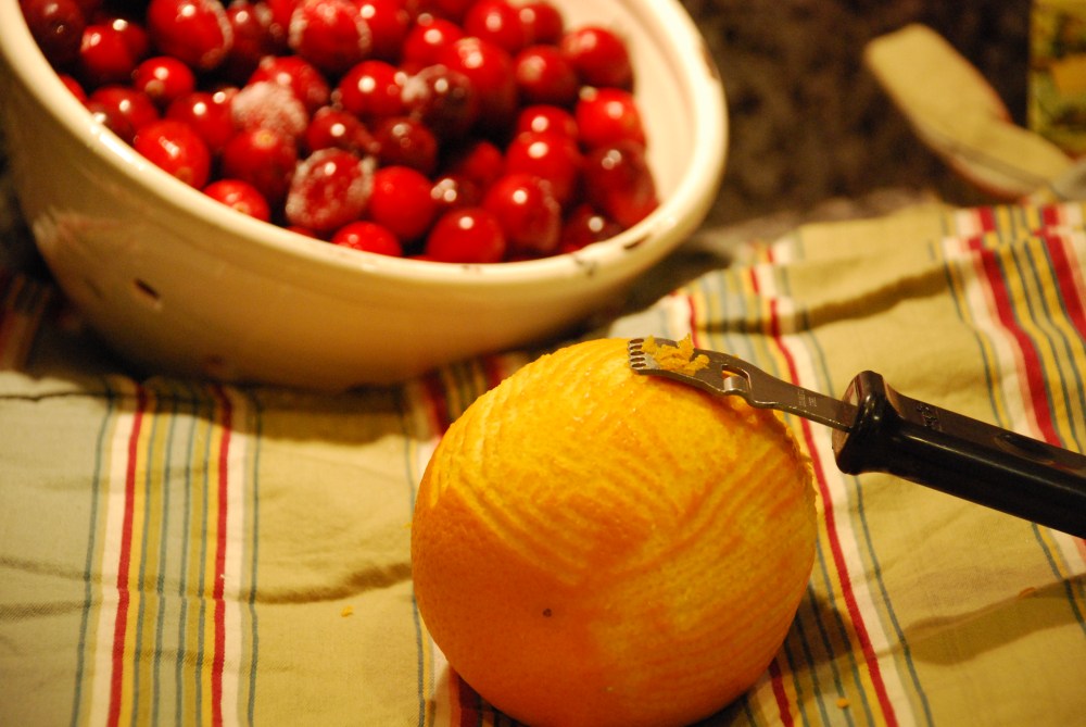 Wash and sort through the cranberries looking for little stems and overly mushy berries. Set aside.