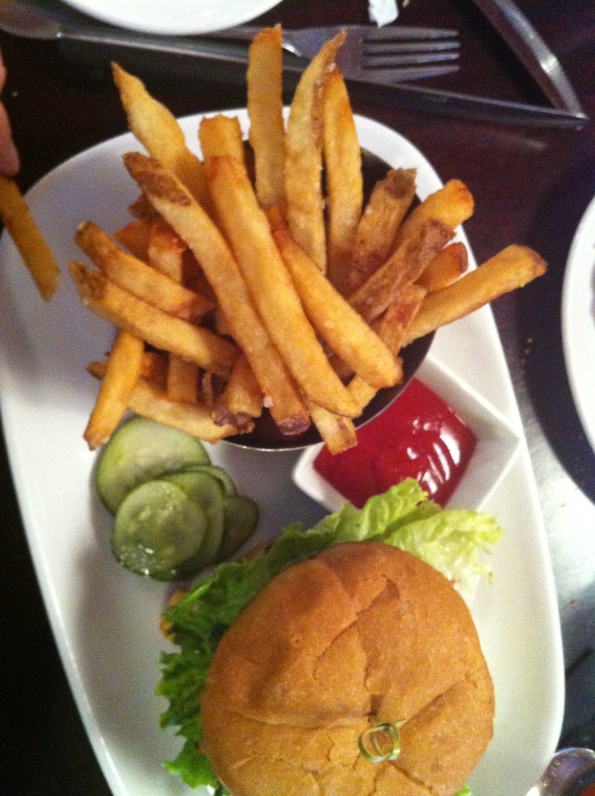 I ordered mine medium rare (I won’t order rare the first time at a restaurant until I know a little more about the burger and the meat.) It came nicely charred on the outside and perfectly cooked. The pickles were good with just a hint of sweetness, that I don’t usually tolerate, but somehow it worked. The bread was soft enough and the juices soaked into the bottom of the bun making it not stodgy at all. One of my burger pet peeves is a bready bun. The burger itself was tender and tasty. I tend to like a thin burger, but this was one that would please the thick or thin patty lover. Chef Turano gets the meat for his burger from Bianco & Sons in Revere. This is one of the top burgers I’ve had. I recommend it highly.