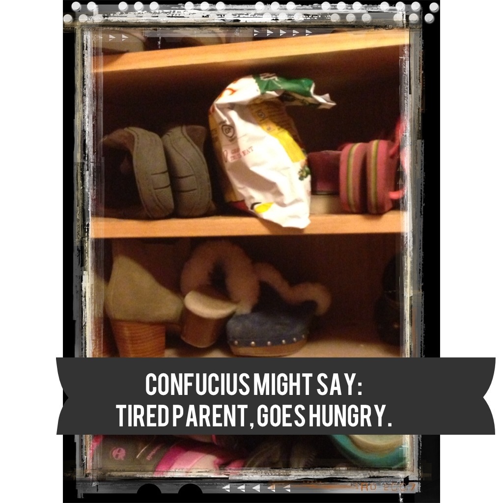 On our way out the door to camp, a rare rainy morning required rain boots. I opened the shoe cabinet to find not only my Hunter rain booties but wedged between all the shoes a bag of tortilla chips.