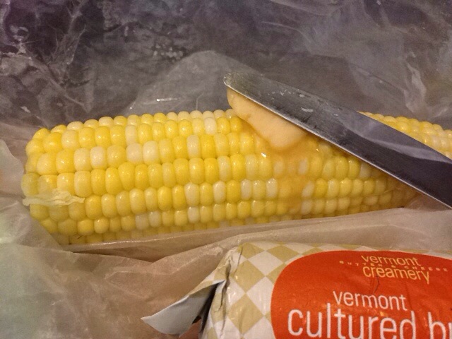 So that was dinner. Breakfast was just the smoothie connection. Now onto lunch. This week I had some corn from my Lindentree CSA share and more corn from my Vermont Farmers via Farmers To You. I also had a jar of the new Olive Oil Hellman’s mayonnaise thanks to my friend Mommy Niri. Last but certainly not least was some Vermont Creamery maple, sea salted butter. So lunch had both savory and sweet included.