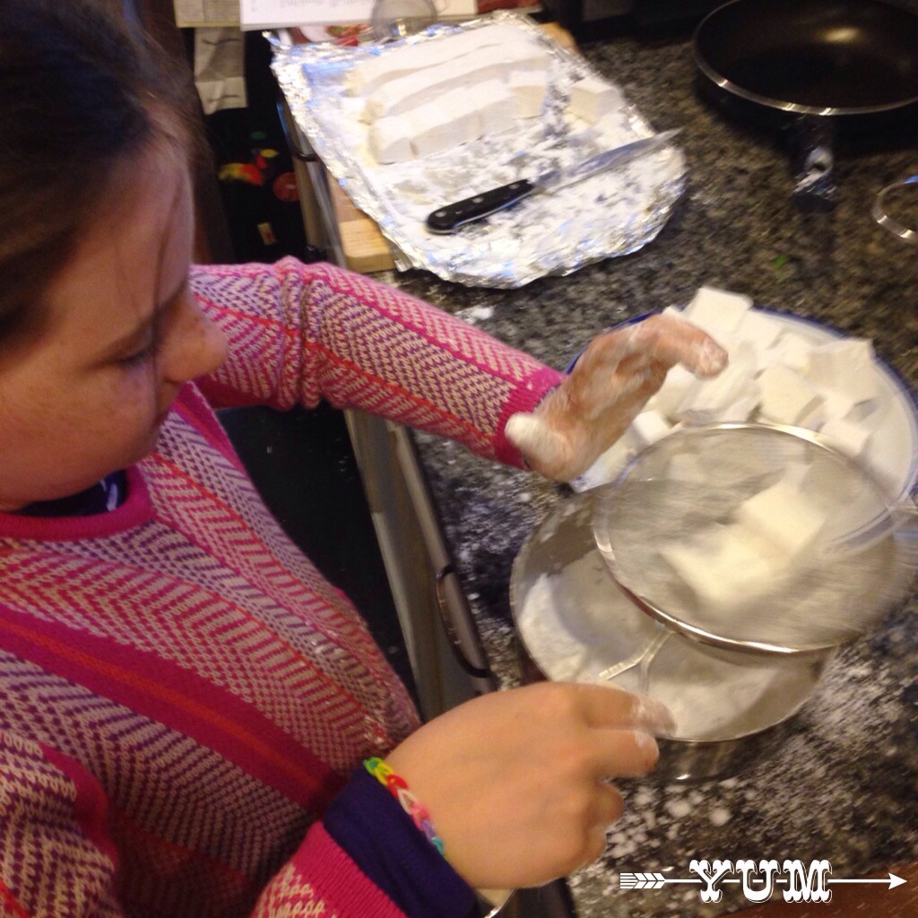 Rolling the cut pieces of marshmallows in the corn starch/confectioner’s sugar mix is like playing in the sandbox. Then, tapping off the excess in a sieve and making it snow is just as fun.