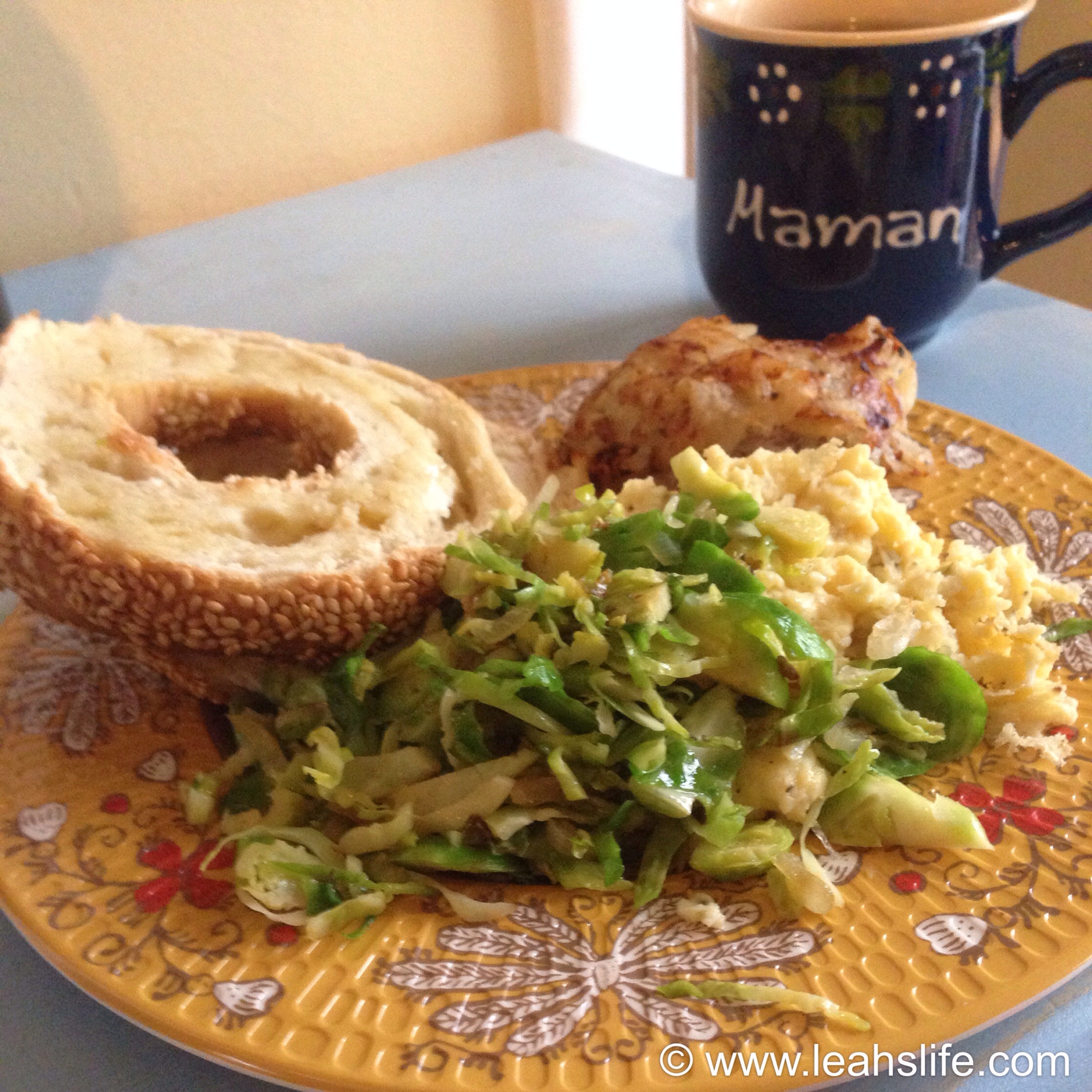 Julienned brussel sprouts with shallots, scrambled eggs and latkes or (for the non-kosher plate) sausage latke patties
