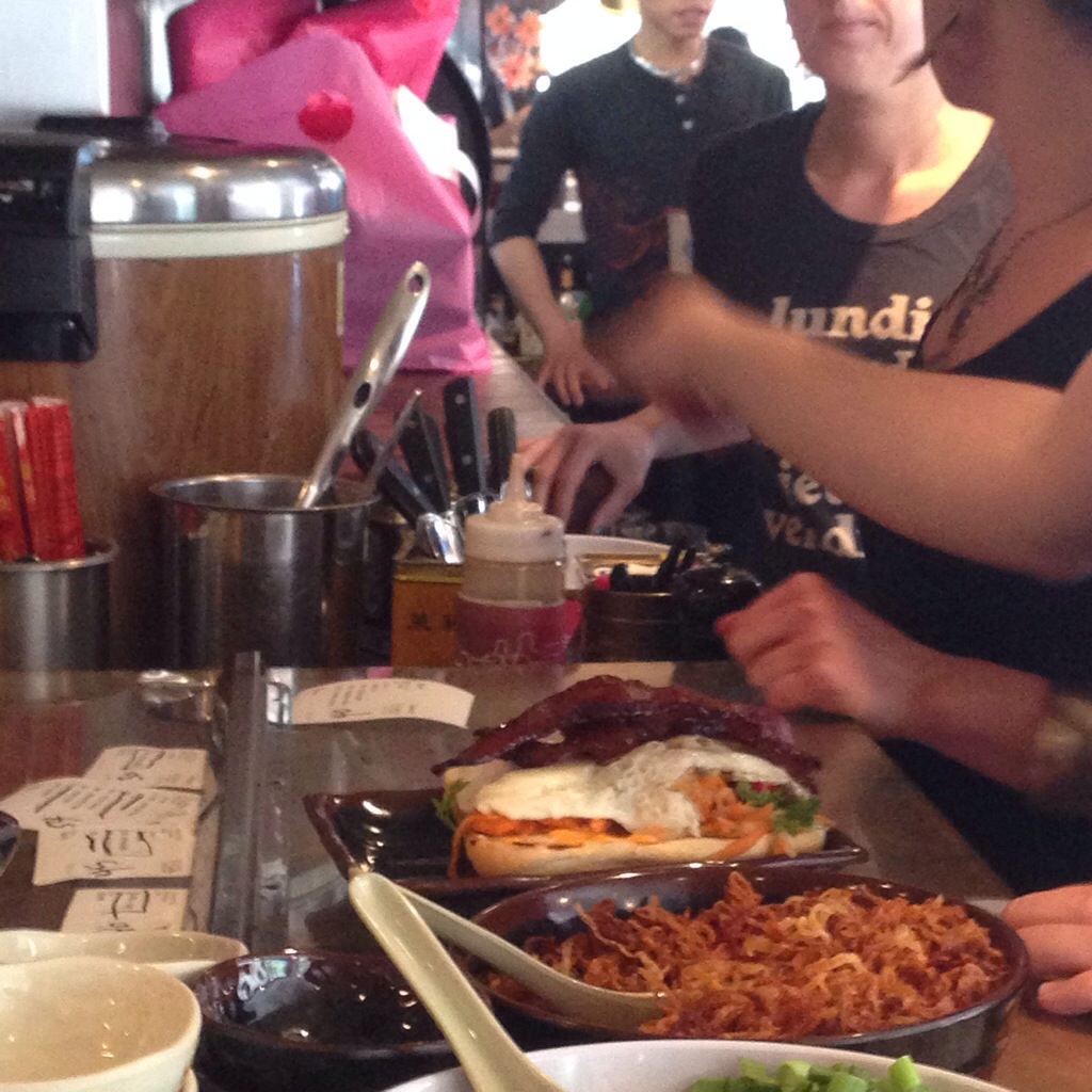 Example 2- Do you see that dish on the pass? It looks like heaven. It’s not mine because I’ve got a fabulous bowl of rice and charred vegetables sitting below my chopsticks. But this egg bahn mi from Myers and Chang looks decadent and delectable with several slabs of mahogany bacon perched on top of the eggs. I think I’d like to share this with one or two people.