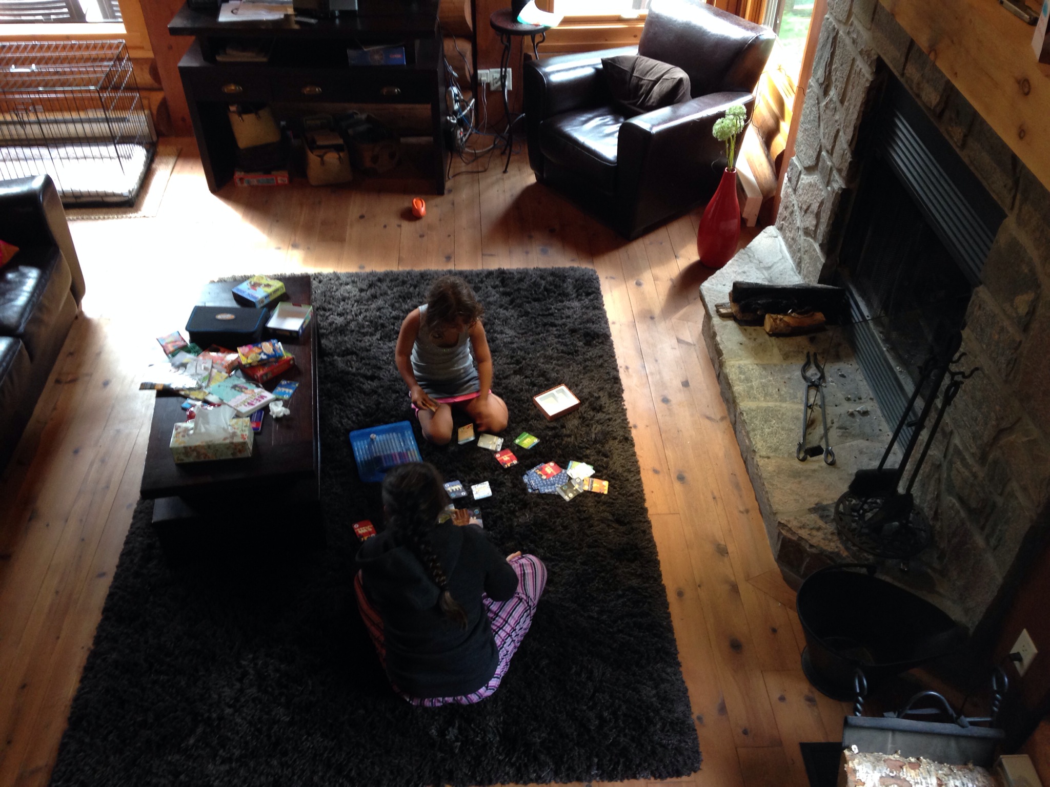 Duck Duck Bruce card game on vacation time.So as I work. I am also playing.  As I’m playing in the kitchen, the kids are enjoying the stretched out morning hours after a nice breakfast of eggs and Montreal bagels and a Quebec strawberry smoothie, playing cards on the rug.  Playing as the sounds from the kitchen, and the click from the camera, and the smells of cinnamon waft from the oven around them.