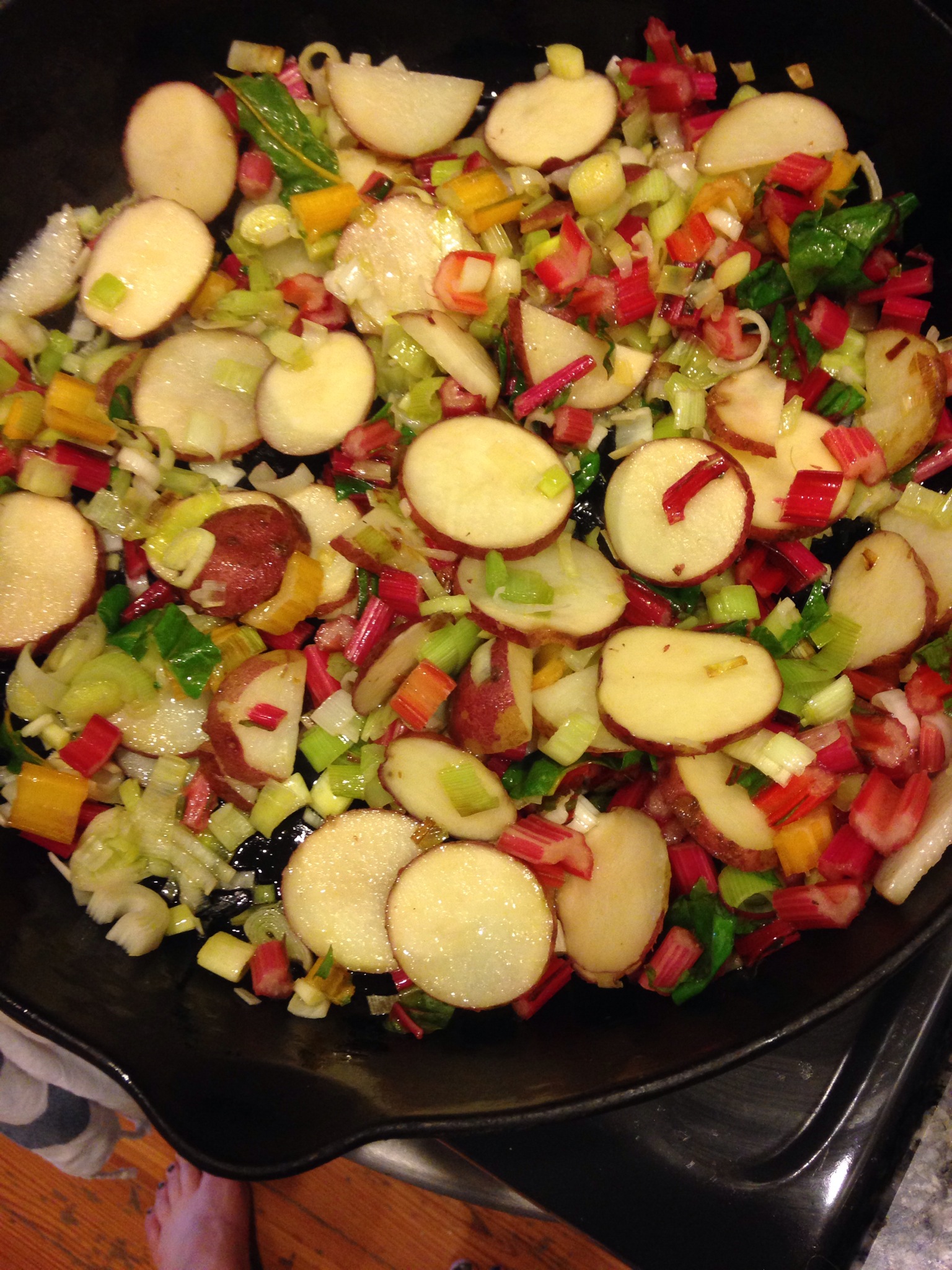 5-Carefully create a carpet of chard leaves over the potatoes, chard and leeks. This will help the potatoes steam. Let it all cook for 3 more minutes.