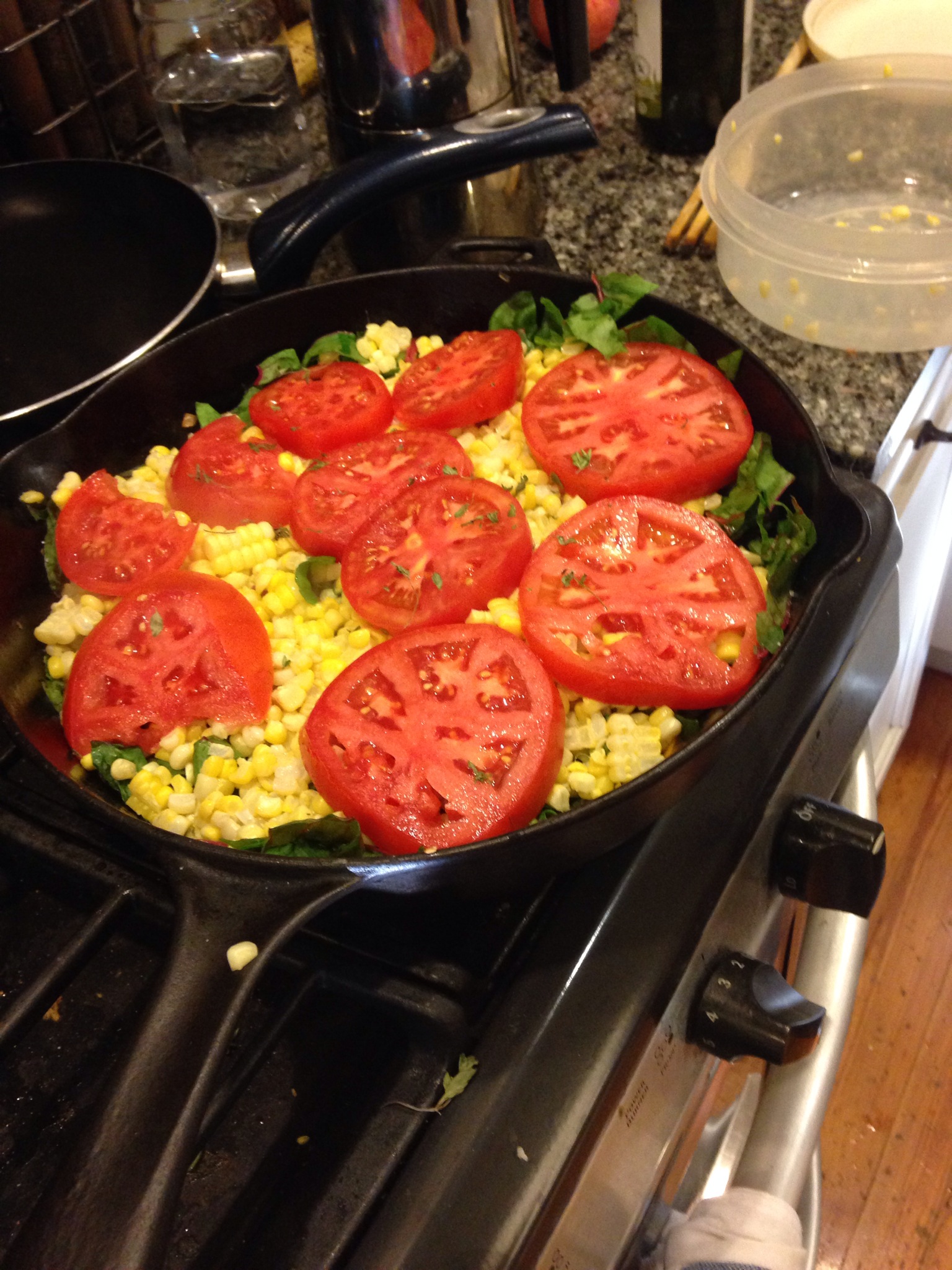 7- Add slices of tomato over the corn to cover. Drizzle the tomatoes with a good olive oil (I used Aria olive oil from Formaggio Kitchen after seeing it here in Boston Magazine in Leah Mennies’ story celebrating Jody Adams’ Rialto).