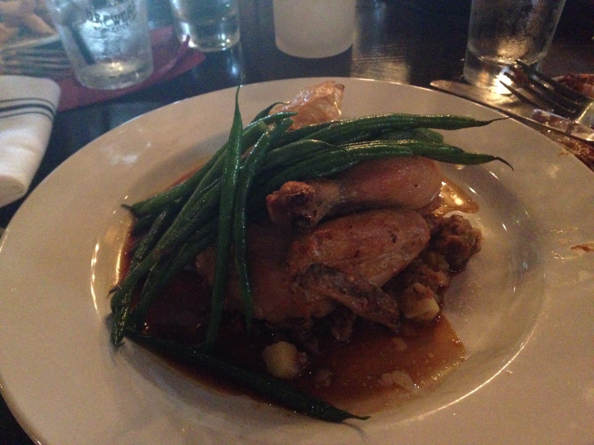 It is so easy to over cook these little haricots vert but the roasted chicken was served with perfectly cooked green beans. The chicken had a nicely crisped skin and was juicy. The roasted chicken was served in top of that earthy sausage stuffing and the leftovers were packed up and will make a great dinner for my husband and I so all I need to do is make a salad.