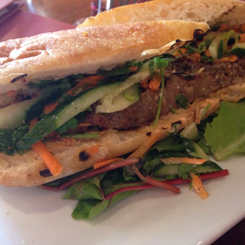 The hamburger looked like a Vietnamese bahn mi it was on a long Iggy’s ciabatta roll. The burger was a bit more like a slice of meatloaf, but the best, lightest, most tasty, lemongrassy meatloaf you’ve ever had.