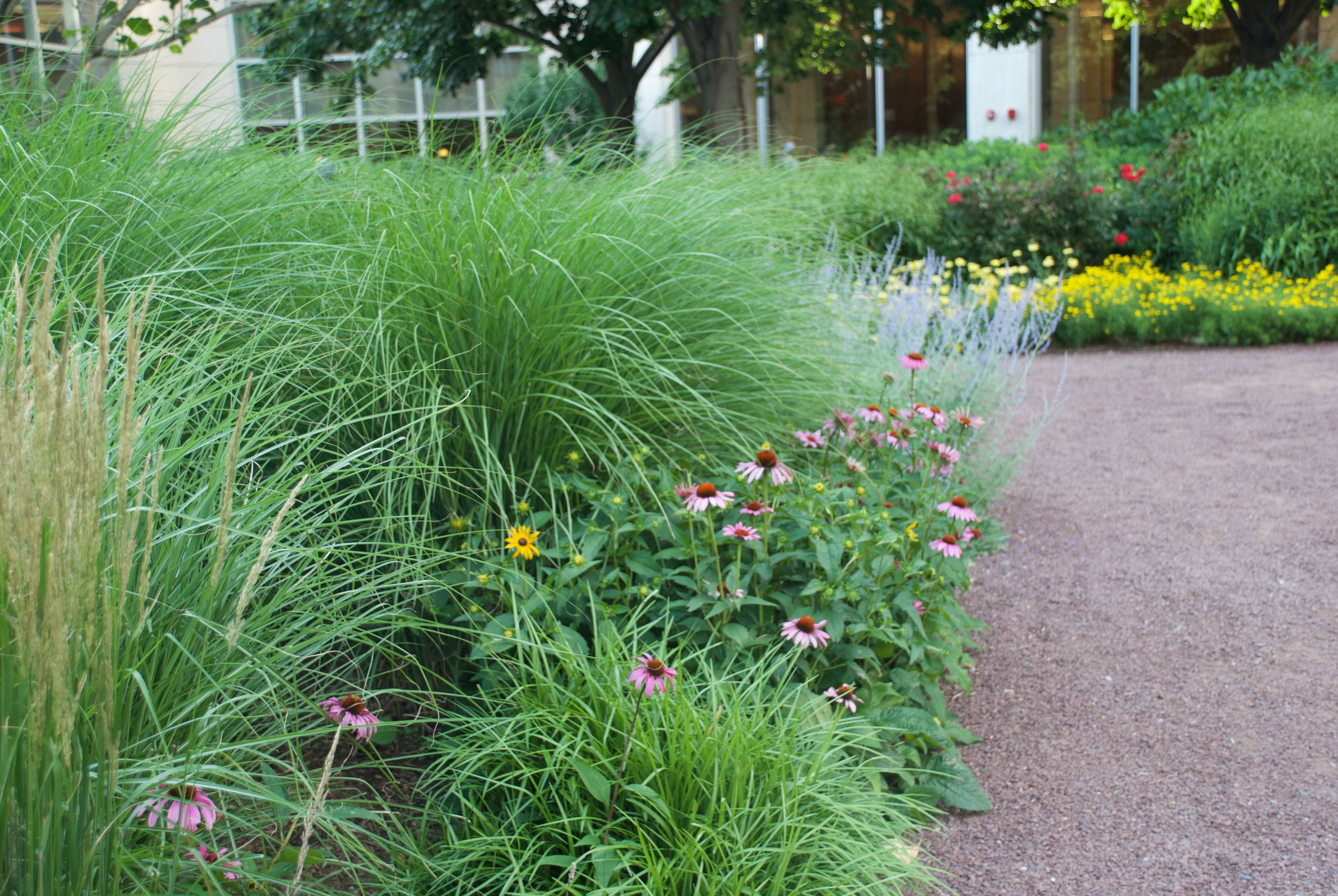 The Prudential Center's South Garden is a perfect urban oasis with flowers, a sandy path, and a beautiful lawn to lay out blankets for the movies.