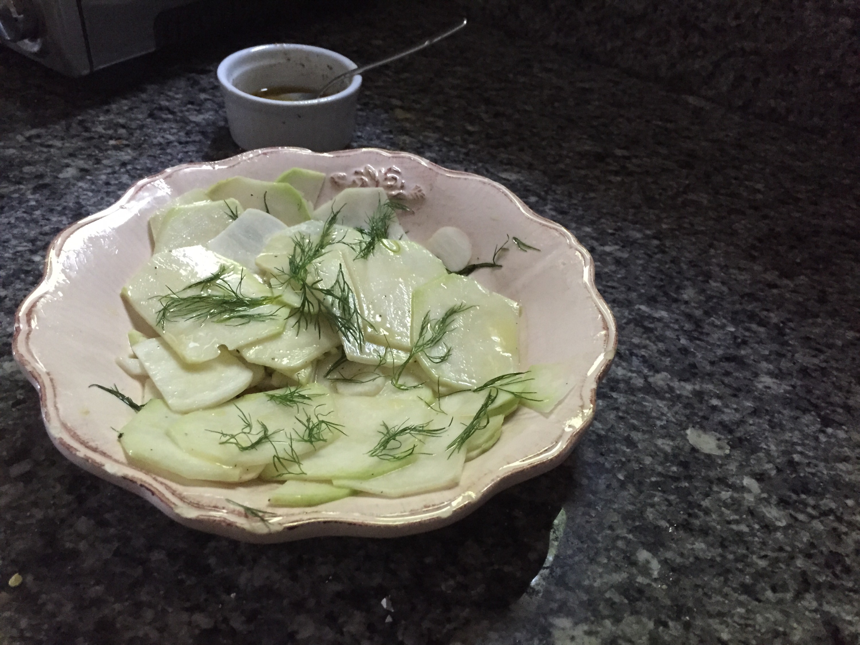 - Generously pour the dressing (you will have some leftover for salads later in the week) over the kohlrabi. Mix around to cover all of the kohlrabi. Break off pieces of the dill frond and toss it into the salad. Sprinkle with a little kosher or Malden sea salt to finish.