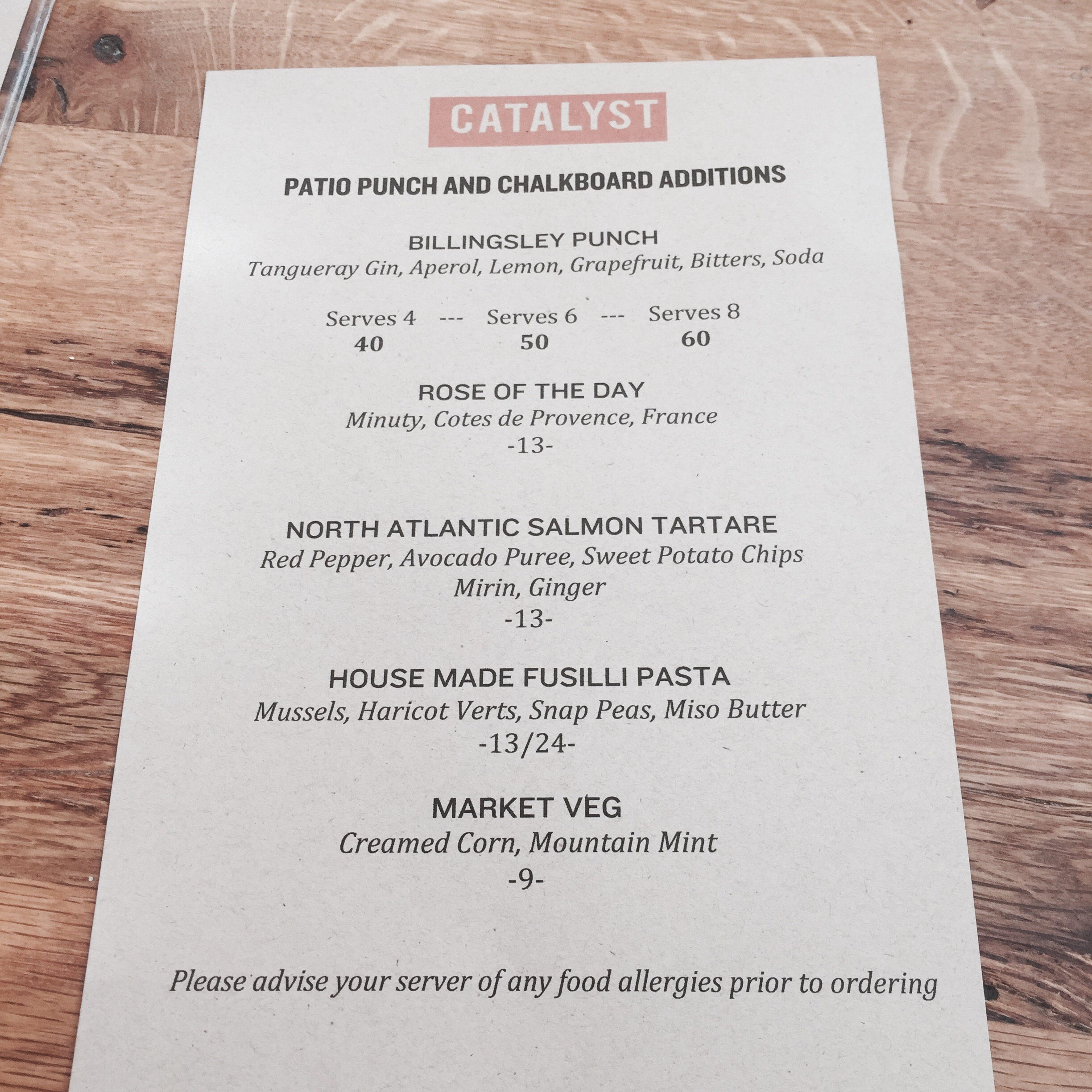 Catalyst in Cambridge, has the ideal way for you to take this wonderful habit for a test drive. So first, make sure you eat a good breakfast. There is no need to go crazy. A coffee, tea, smoothie, and a small bite to eat will do. Then, take a friend, a few colleagues, and go eat a good lunch. Take your time with lunch, eat well, eat slowly experience it as the meal it should be. Working lunch, power lunch, lunch break are all unacceptible alternatives to a proper lunch. Then, later in the evening when you feel a bit peckish, grab a few friends 3 or 5 or 7 is a great number. Head to the patio at Catalyst and you can enjoy punch with friends and a few bites from the perfect summer patio menu. The punch is served in vintage punch bowls and transports you to a time when things seemed simpler and the pace was slower. Chef Kovel’s food is the perfect food for a “small bites” dinner because the layering of his flavours is impeccable and the flavours are bold, textures are correct, and if you choose well you can pair it all nicely with the punch du jour. The punch serves 4, 6 or 8 people. It is available on the patio only and is offered with the chalkboard specials. It really is the perfect way to dine this summer.