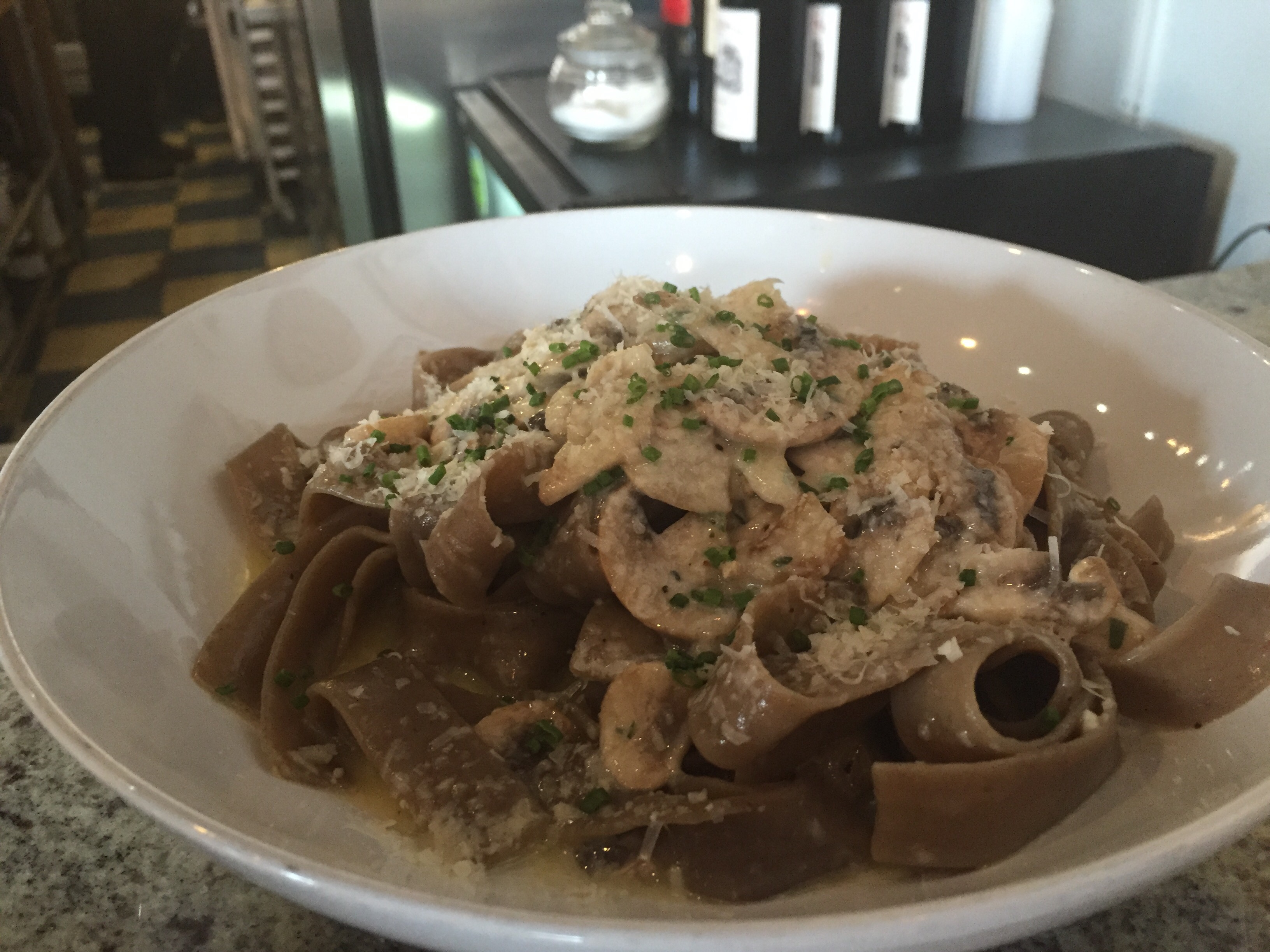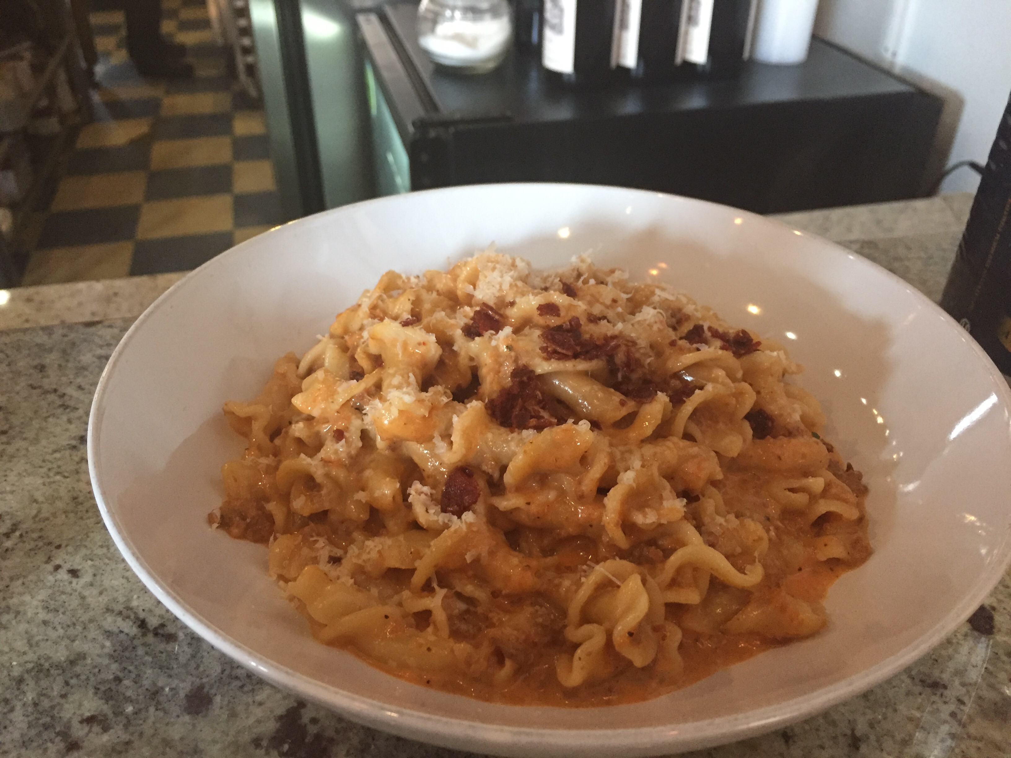 The menu is small but not so small that you feel restricted. A selection of pastas made in house are listed on the chalkboard menu alongside pizzas and paninis. The paninis are served with addictively delicous homemade potato chips. On an easel by the counter (which I like to call the “chef’s table”) are a daily special appetizer.