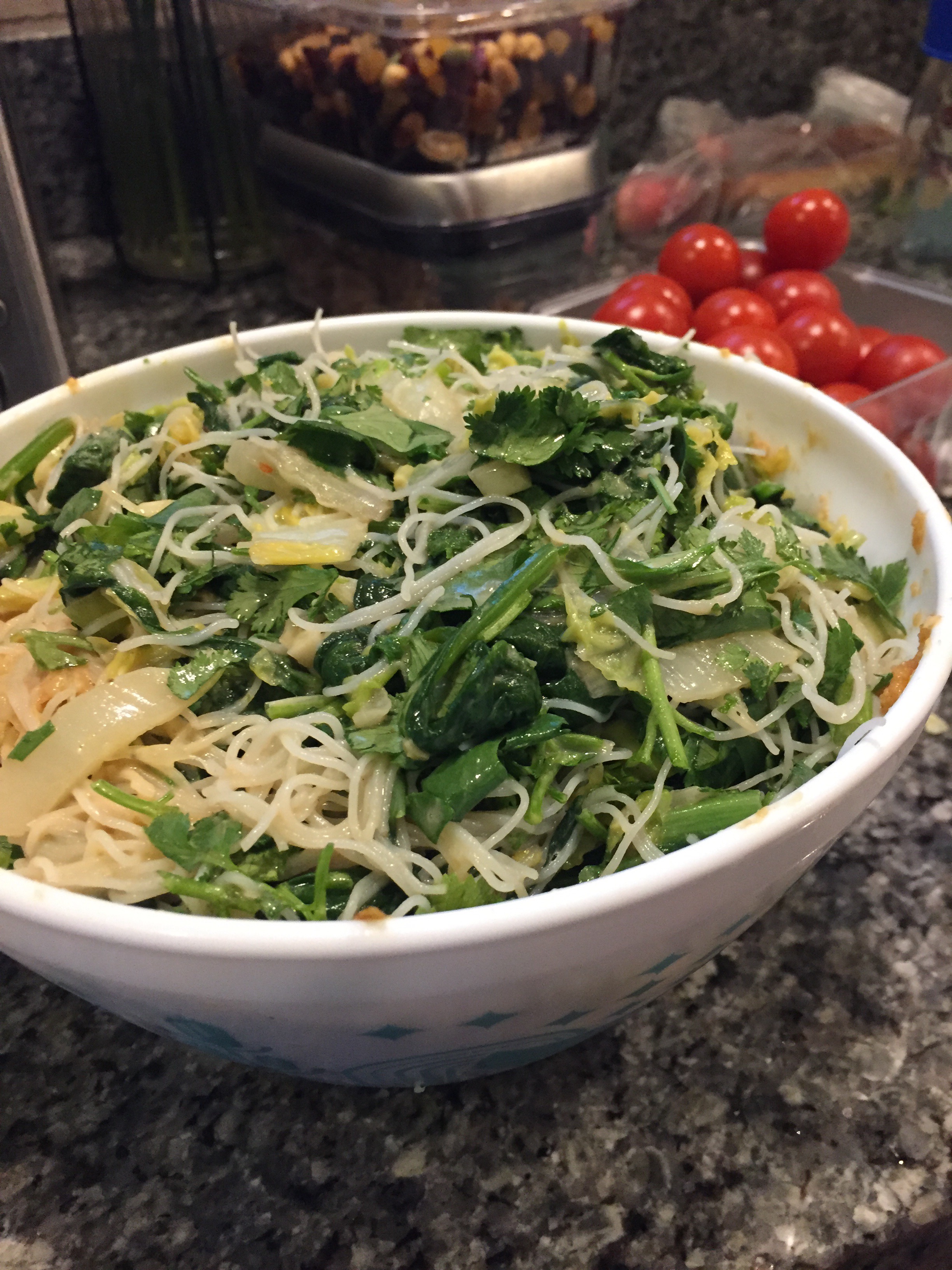 This weekend Isabelle made Vietnamese soft rolls ( I wish I had a picture because they turned out beautifully but we just ate them with gusto instead of photographing them first). So, we had left over vermicelli/rice noodles. Dan used a bunch of them last night to make Singapore noodles with the bok choy and some of the spinach but there was plenty left over.