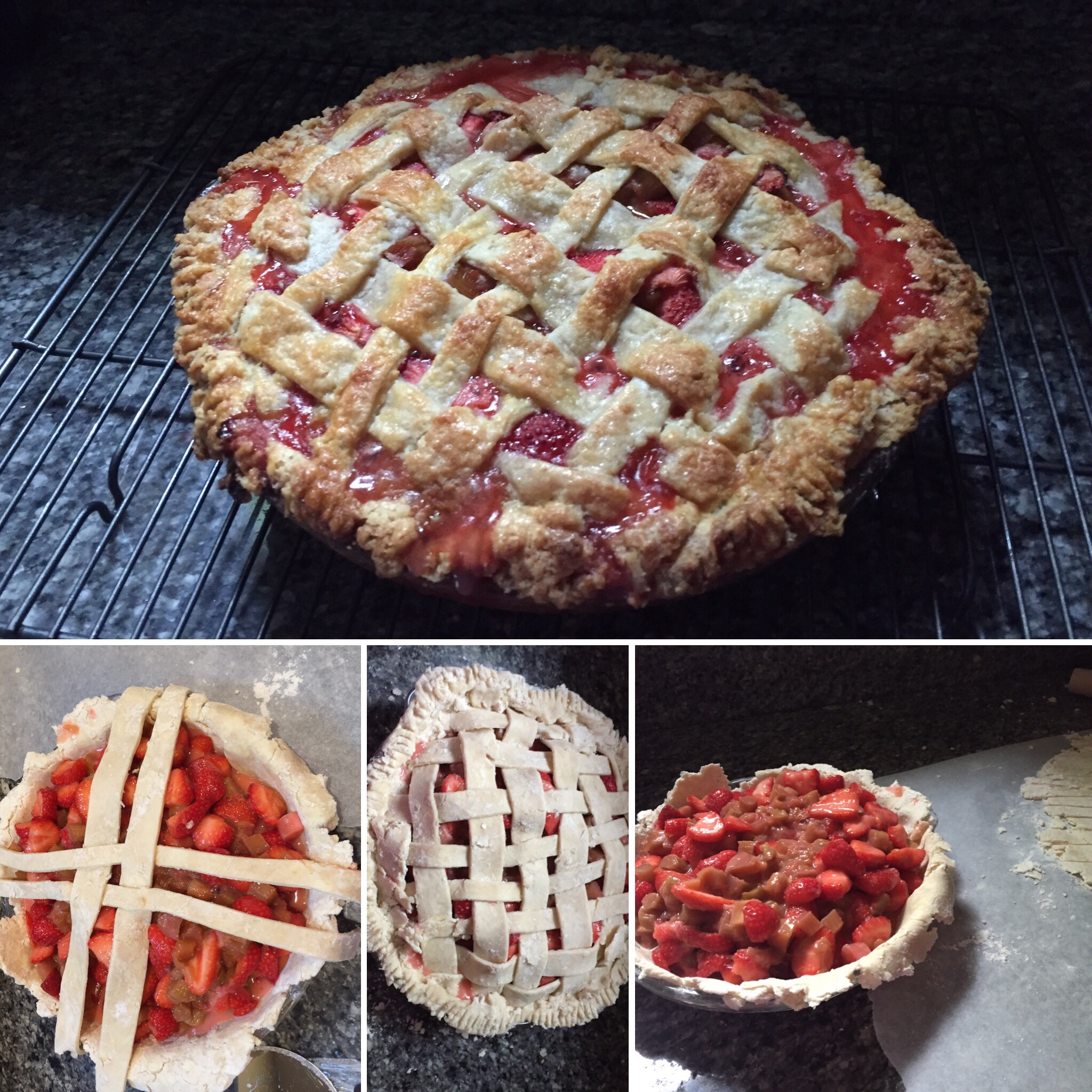 Today, I found this strawberry rhubarb pie recipe and I used it as a guide for my filling and my cooking times. I used a mix of tapioca starch and corn starch to thicken the juices a little. I stew my rhubarb lightly first (with Jamie Oliver’s recipe), and then I took the 2/3 of the liquid from the stewed rhubarb and mixed it with the starches. I then mixed that slurry into my rhubarb and strawberries in a large bowl. Then, I used a slotted spoon to put the fruit into the pie.
