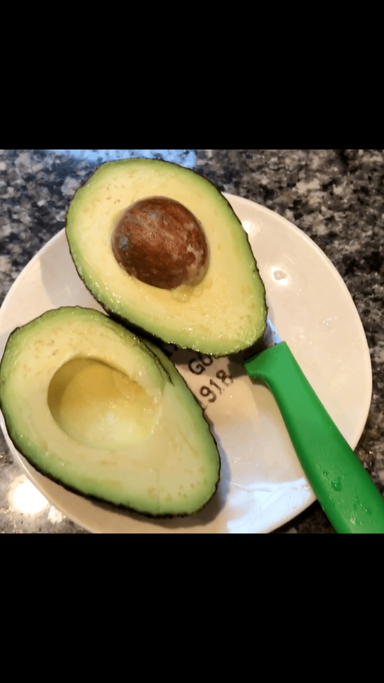 - Sprinkle a little salt inside each 1/2 of the avocado.