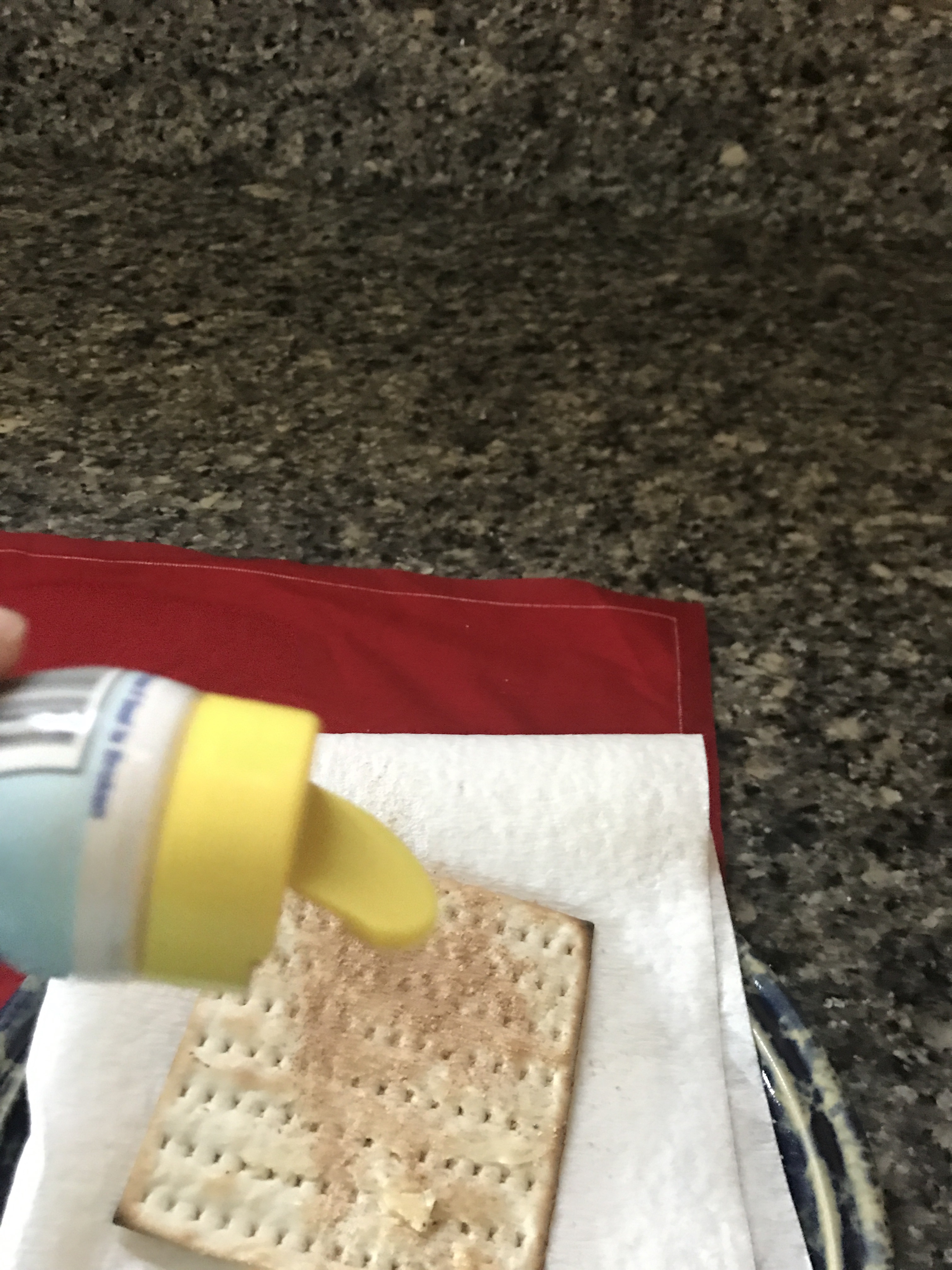 - Melt 1 TBSP of butter. Brush the butter on the matzoh and sprinkle with cinnamon sugar. Continue with enough mini matzohs so everyone has two.