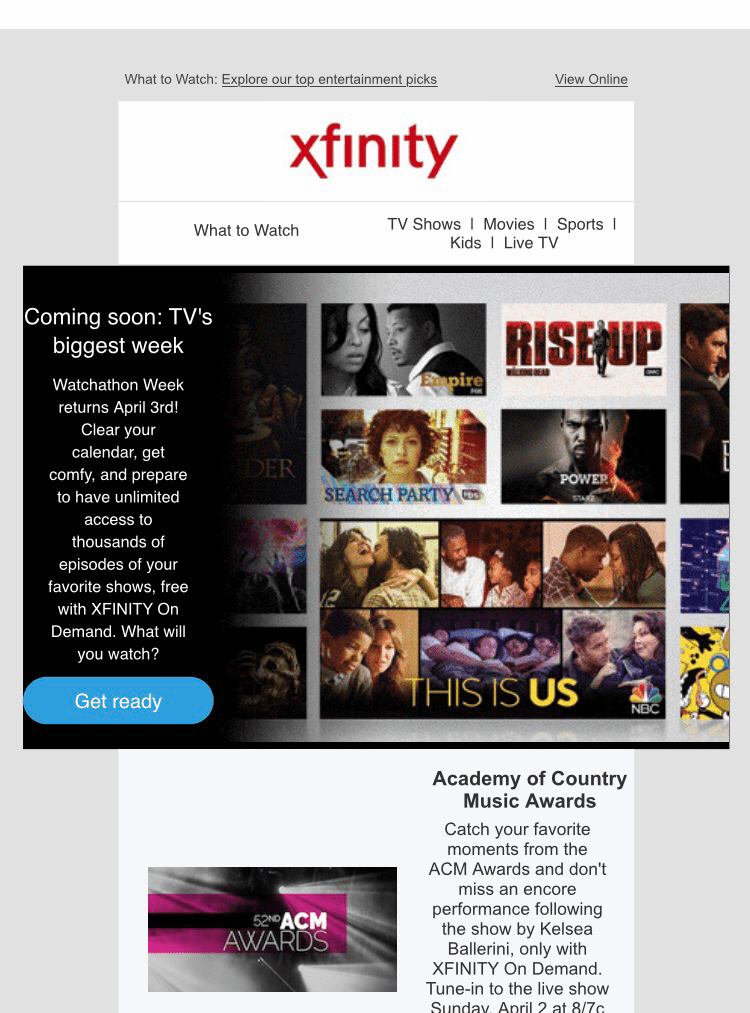 Network’s participating in this year’s Watchathon Week include: A&E, ABC, AMC, Animal Planet, BBCA, BET, Bravo, Cartoon Network, CBS Broadcast, CMT, CNBC, CNN, Comedy Central, Crackle, The CW, Discovery, Disney Channel, Disney Junior, Disney XD, E!, ESPN, Food Network, FOX, FreeForm, FX, FXX, FYI, GSN, HGTV, HISTORY, ID, IFC, Lifetime, Logo, MLB Network, MTV, National Geographic, NBC, OWN, Oxygen, PBS, Science, Showtime, Spike, Sprout, STARZ, STARZ ENCORE, Syfy, TBS, TLC, TNT, Tru TV, TV Land, USA, VH1, Viceland, We TV and WGNA.