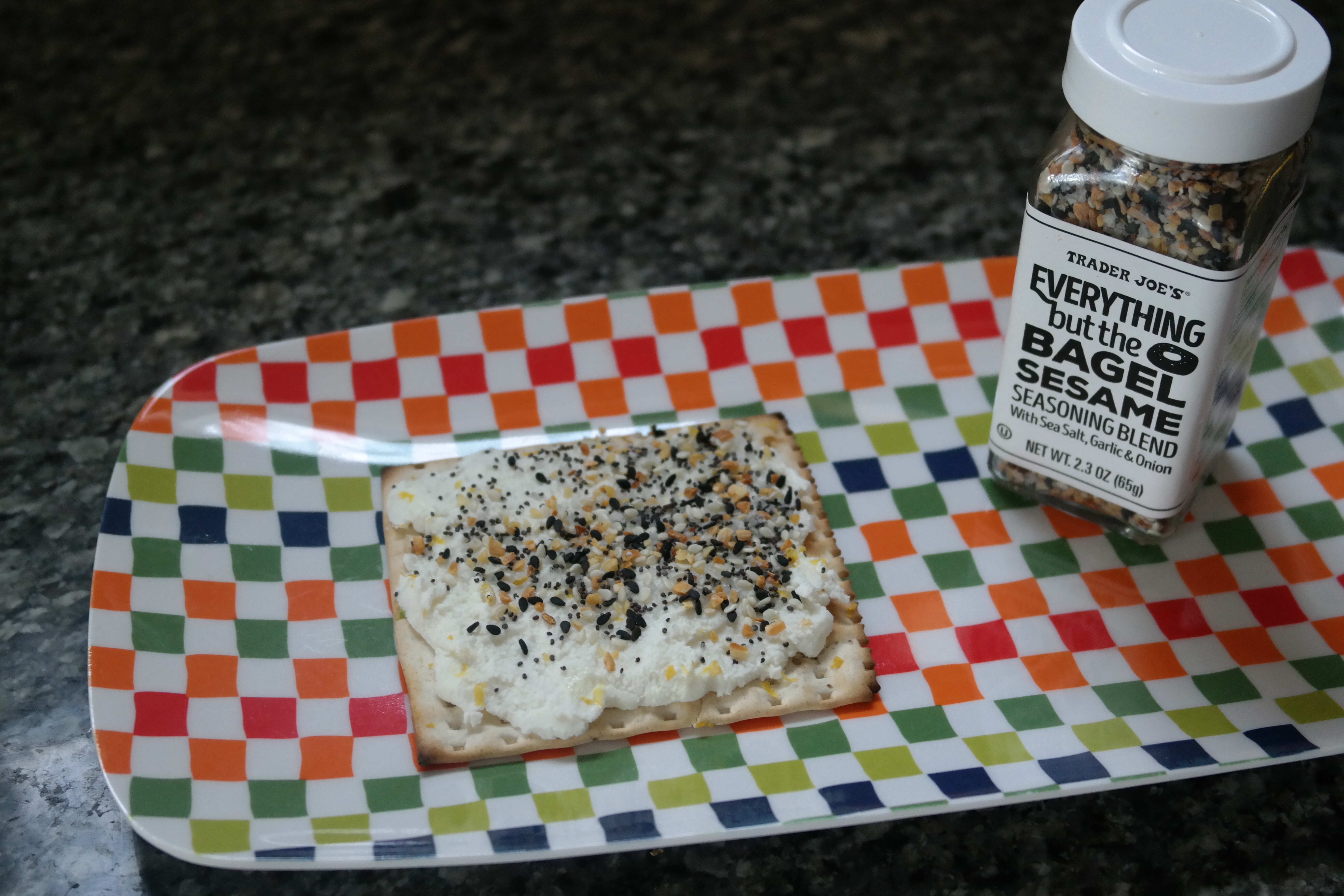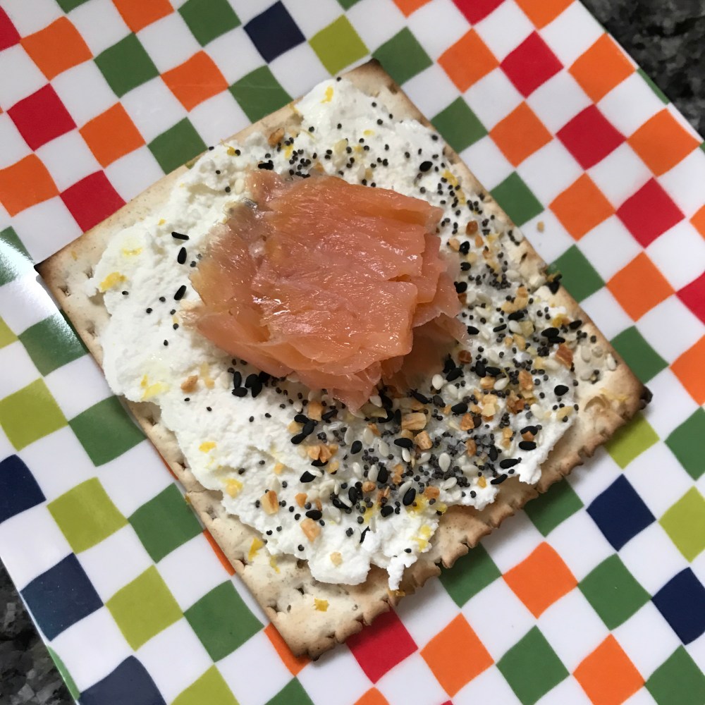 Ingredients: soft cheese (ricotta, cream cheese, quark, cloumage, goat cheese), caraway seeds, everything bagel seasoning, or any of your favourite spices, matzoh