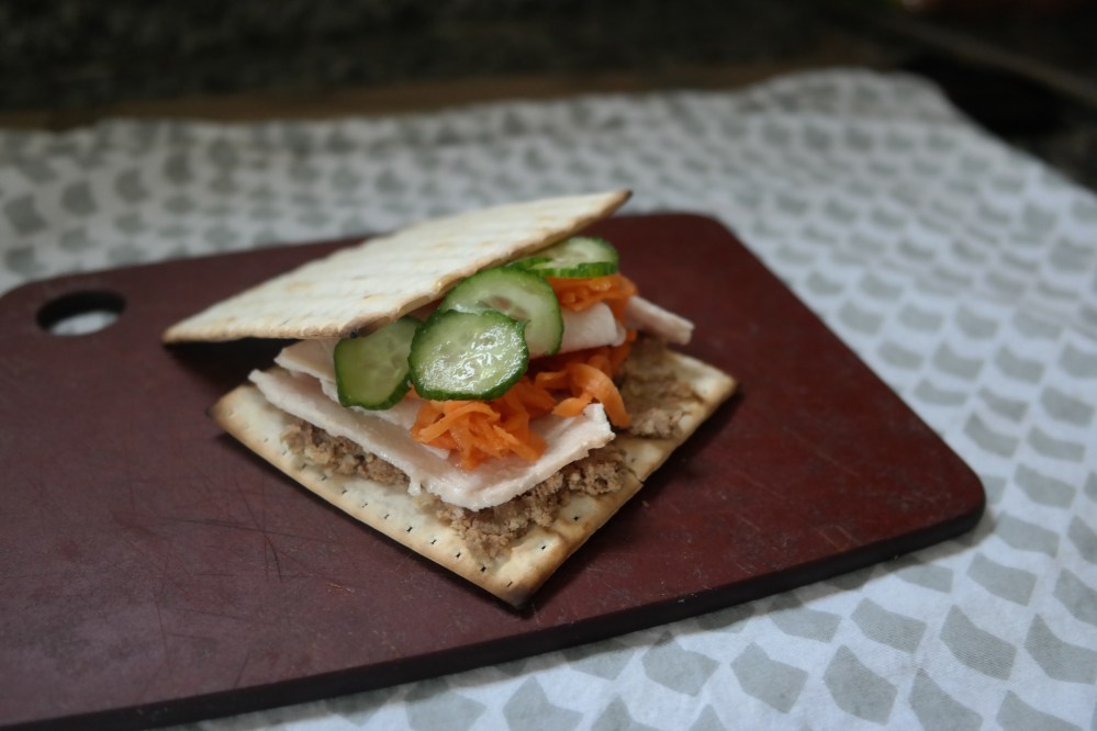 Okay so a Bahn Mi is all about the bread to some but to me its all about the pickles and the pâté. So for Passover you’re not going to get a soft white baguette but you will get all the flavour.