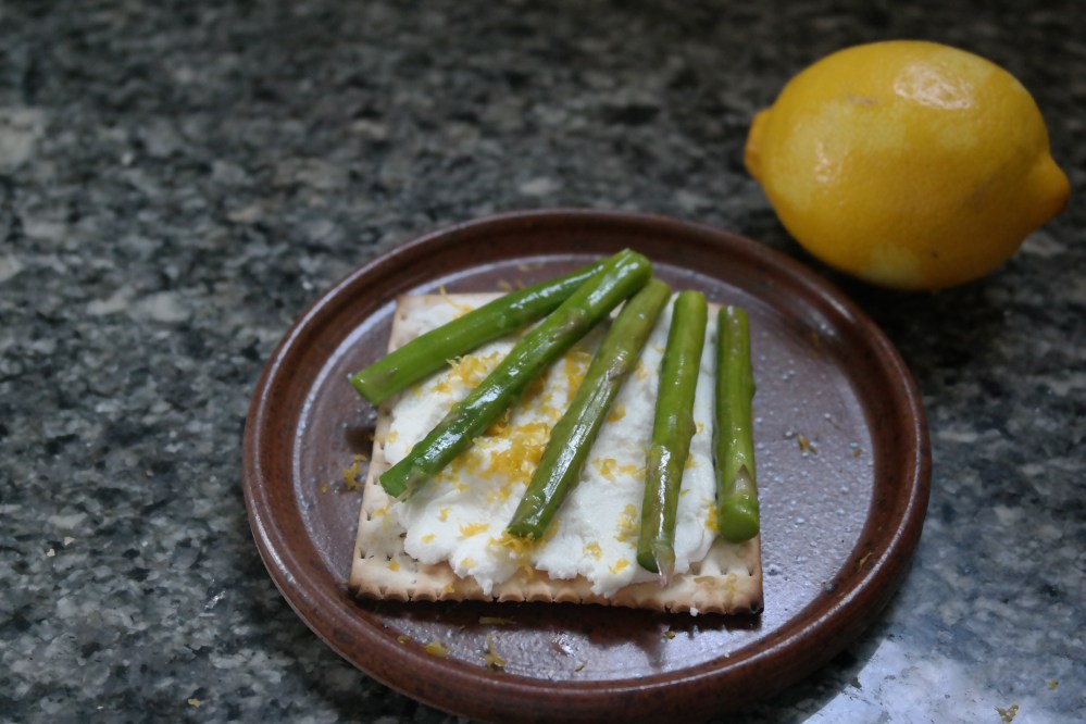 Ingredients: asparagus, ricotta, lemon zest, salt, matzoh