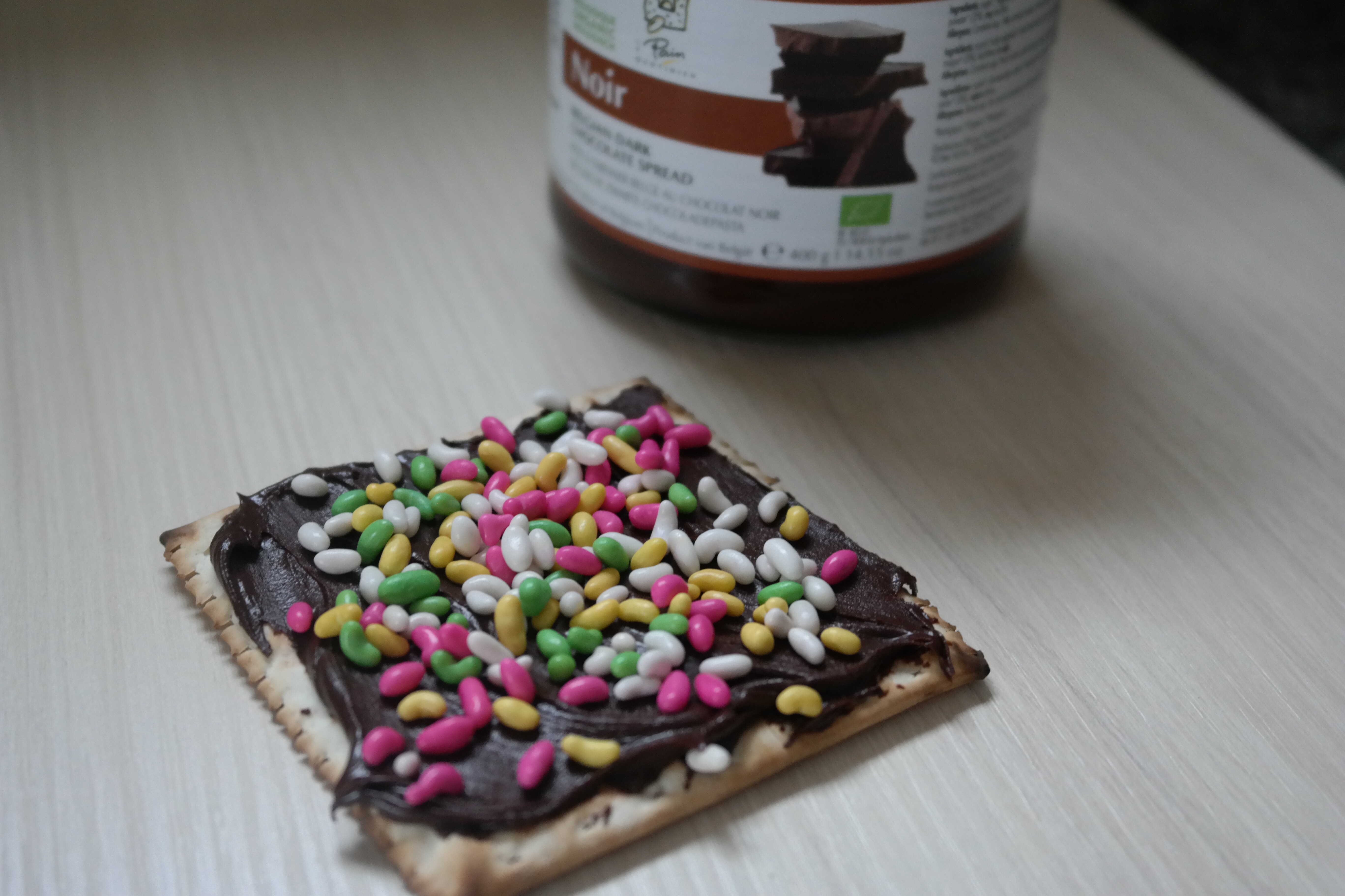 Ingredients: chocolate spread (Nutella, or this non-dairy dark chocolate version from Le Pain Quotidien are what we use), candy-coated fennel or sprinkles, matzoh